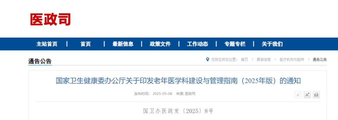 按照党中央、国务院决策部署,为指导规范老年医学科建设与管理,推动完善老年人健康支撑体系,提升老年医学医疗服务能力,满足老年人医疗服务需求,我委于2019年制定印发《老年医学科建设与管理指南(试行)》。在总结老年医学科建设管理经验基础上,我们修订形成《老年医学科建设与管理指南(2025年版)》。现印发给你们,请遵照执行。