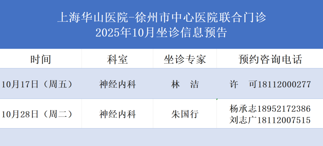 “上海华山医院-徐州市中心医院联合门诊”10月份神经内科专家坐诊信息预告