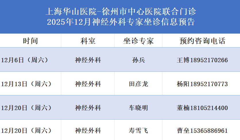 12月,上海华山医院神经外科专家孙兵、田彦龙、车晓明、寿雪飞将坐诊“上海华山医院-徐州市中心医院联合门诊”,专家号源陆续发放,具体信息如下: